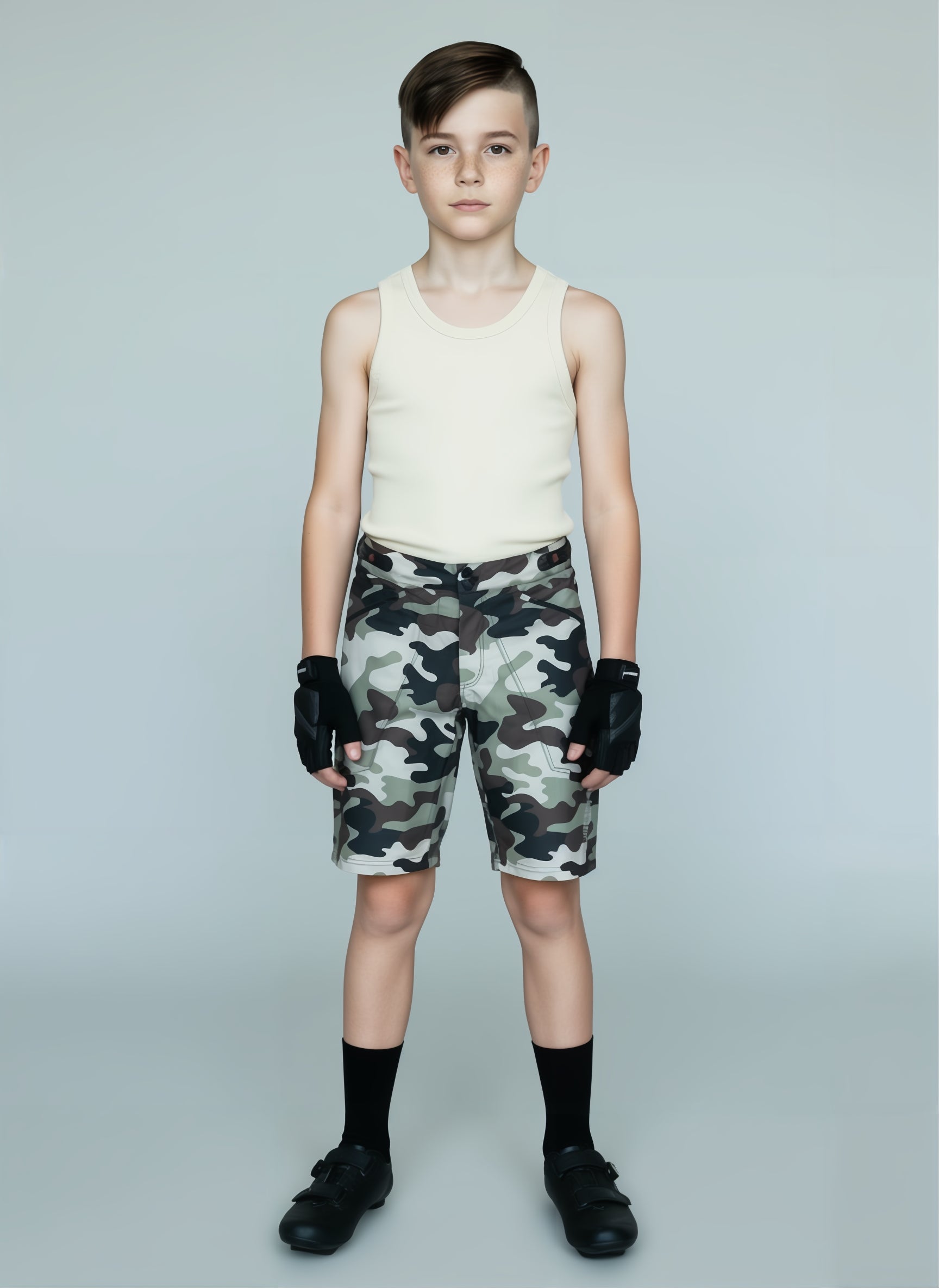 The Shredder Youth MTB Cargo Shorts — Camo Off-Road Cycling Shorts with Padded Liner