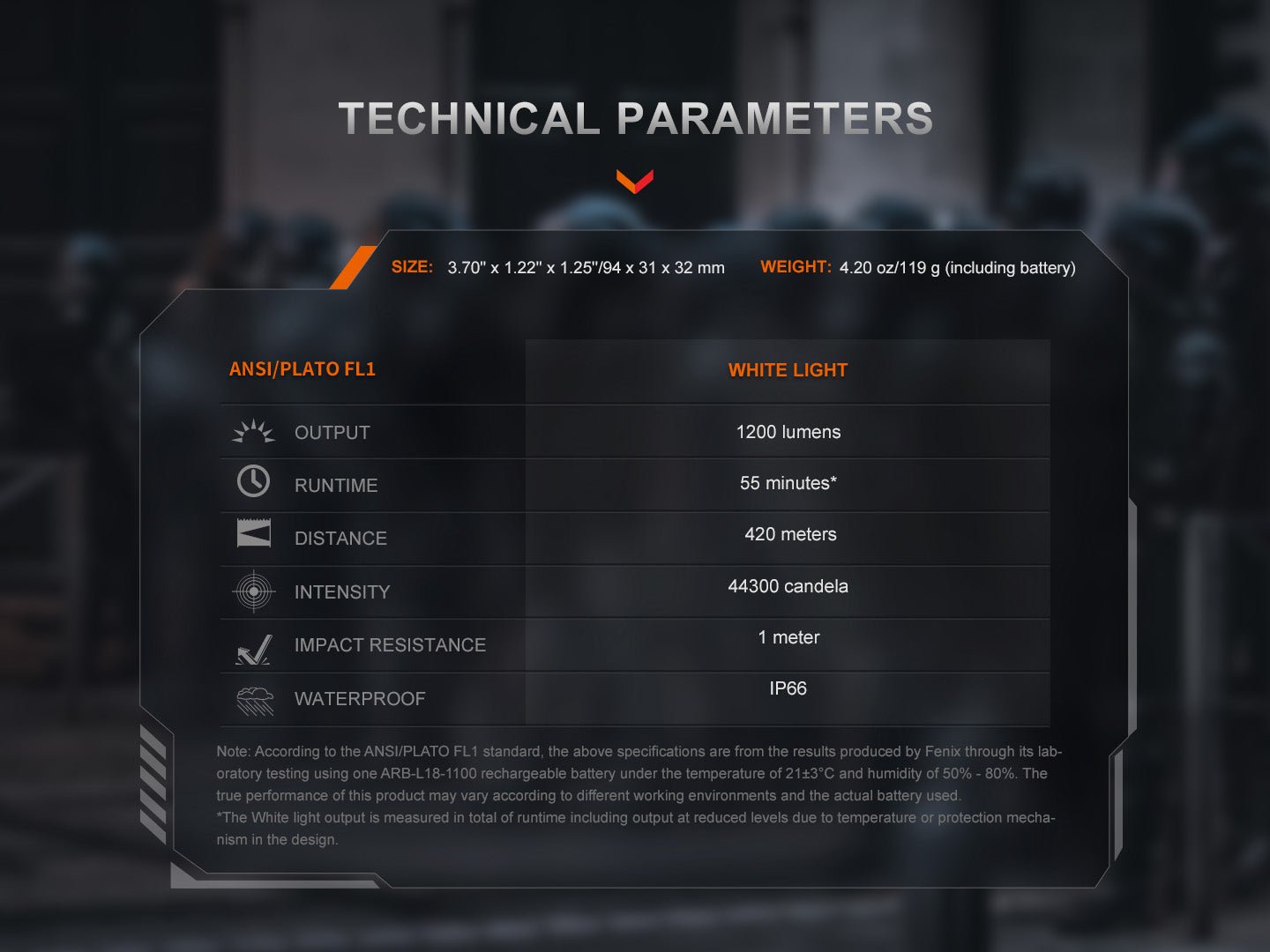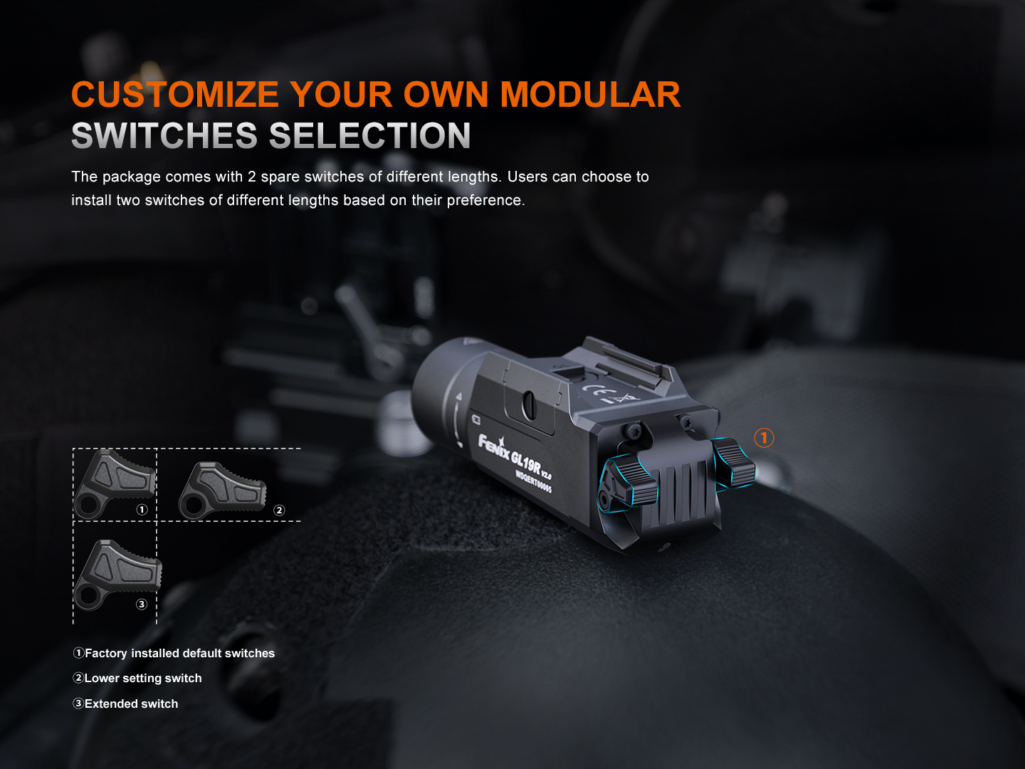 The Fenix GL19R is a premium tactical flashlight engineered for reliability, versatility, and power. Featuring an ultra-high intensity 44,300 candela beam and a maximum output of 1200 lumens, this compact light can illuminate up to 1378 feet, making it perfect for professional use. Its innovative modular switches allow users to customize the activation style. The se ambidextrous mechanical rear switches provide both momentary-on and instant activation options, ensuring seamless operation for both right- and left-handed users.