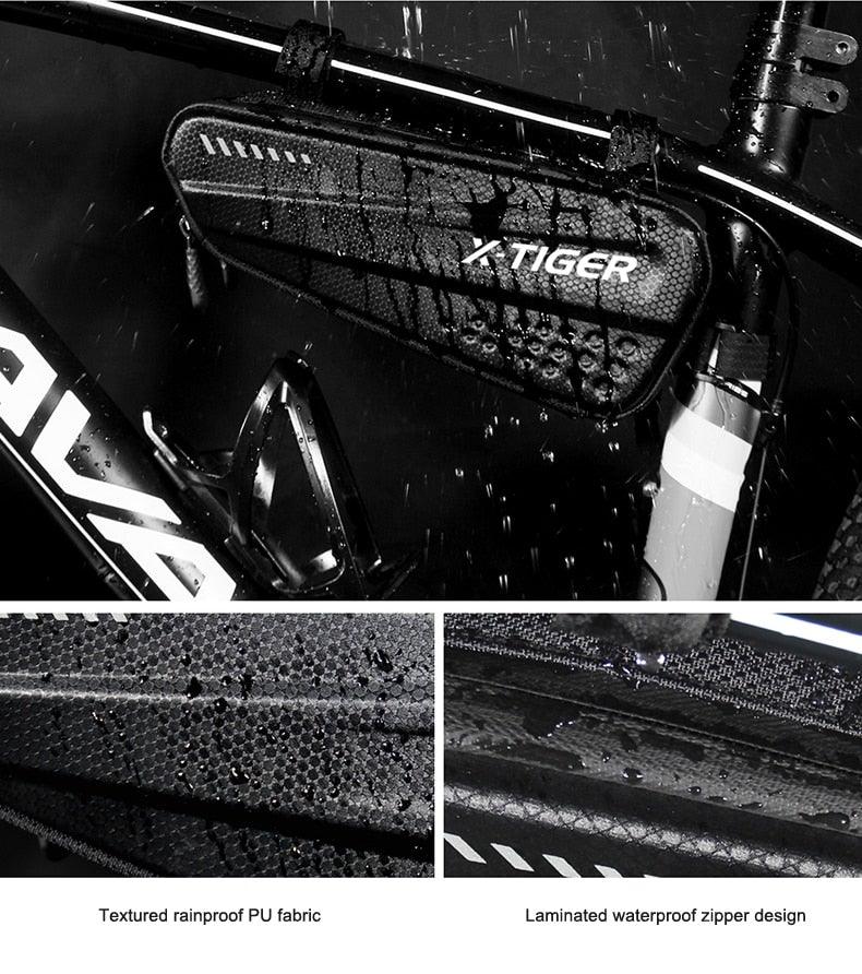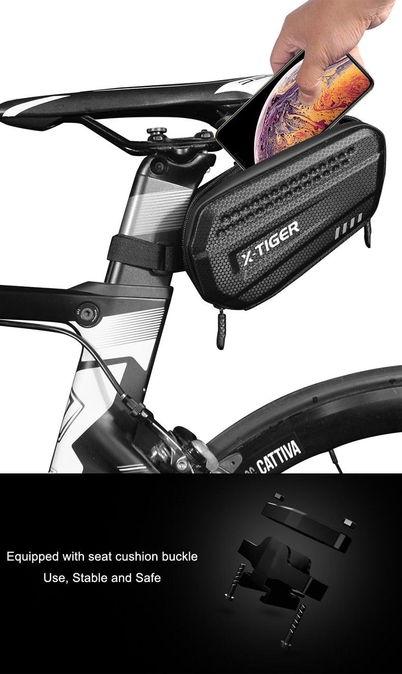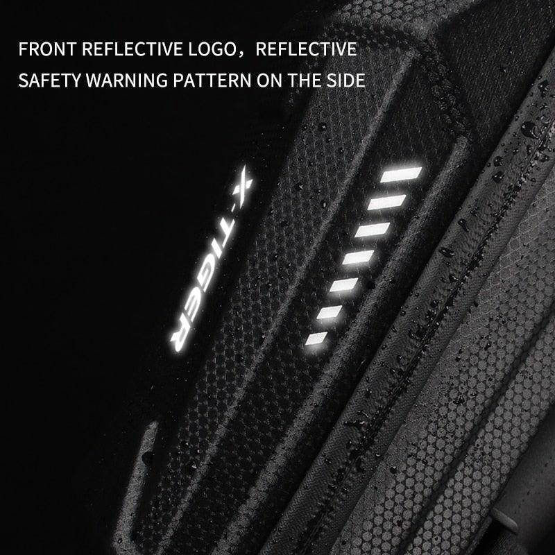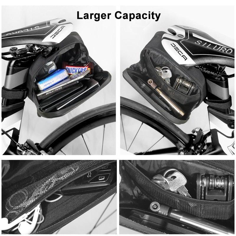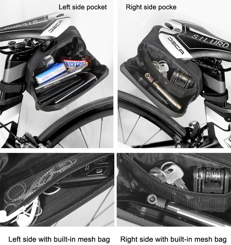 - DUAL SAFE PROTECTION: This cycling accessories storage is designed with reflective signs on the three sides of the bag, it can reflect light from any direction, the bag can be found easily. The reflective tape on the back of the bag can also be used as a mounting ring to install tail lights to improve safety and visibility, which can protect your night riding safety