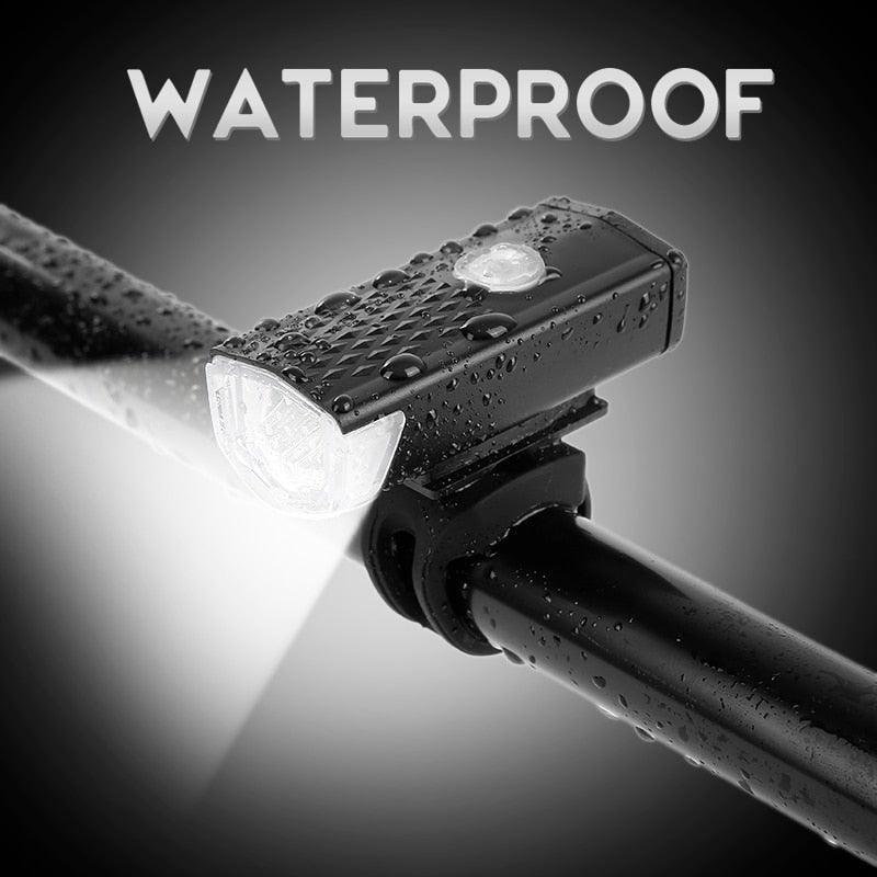 - FRONT HEADLIGHT: Super bright 300 Lumen LED Headlight, built in rechargeable lithium battery long-lasting performance, waterproof and weather resistant. Front bicycle light have three lighting modes( full brightness/half brightness/ fast flashing ).