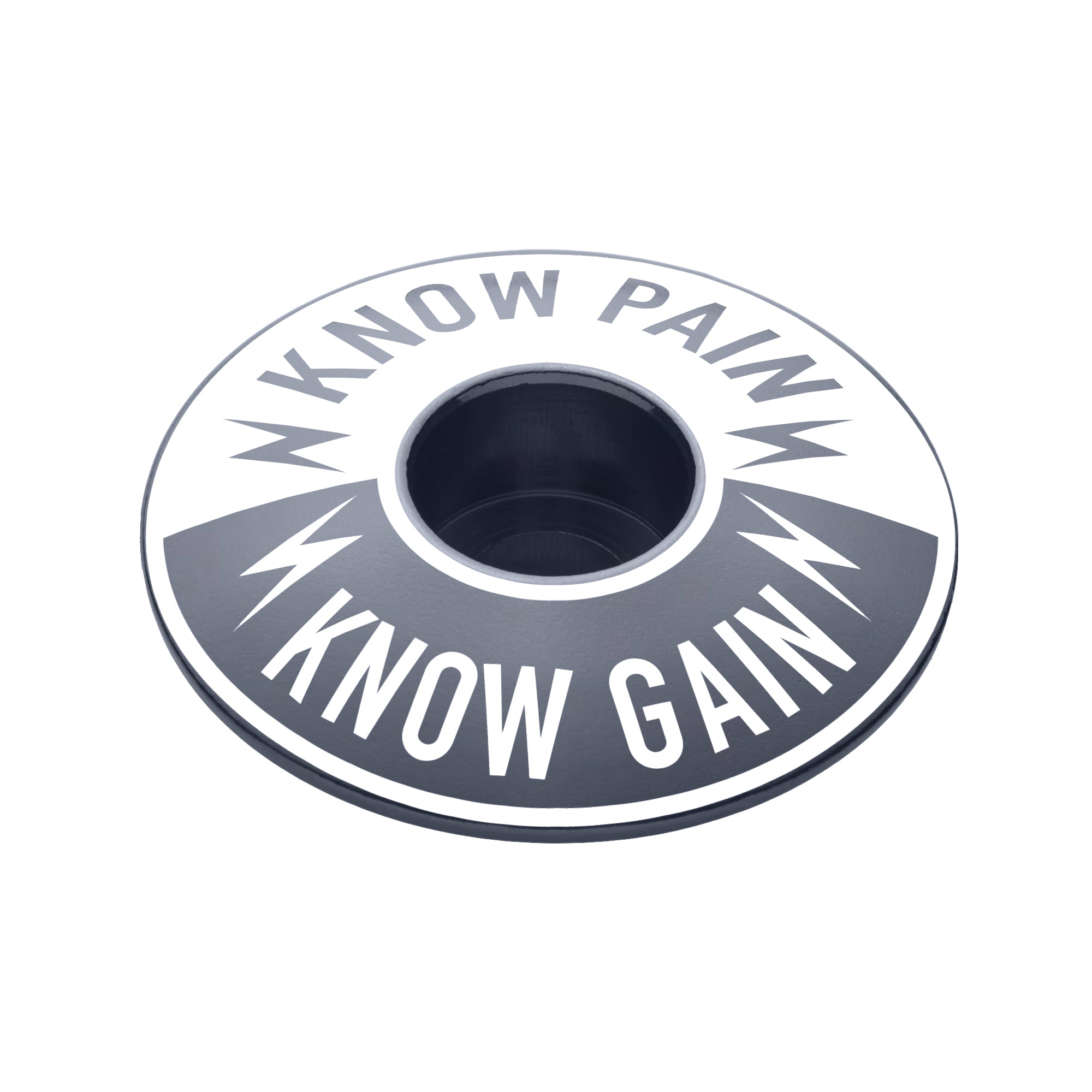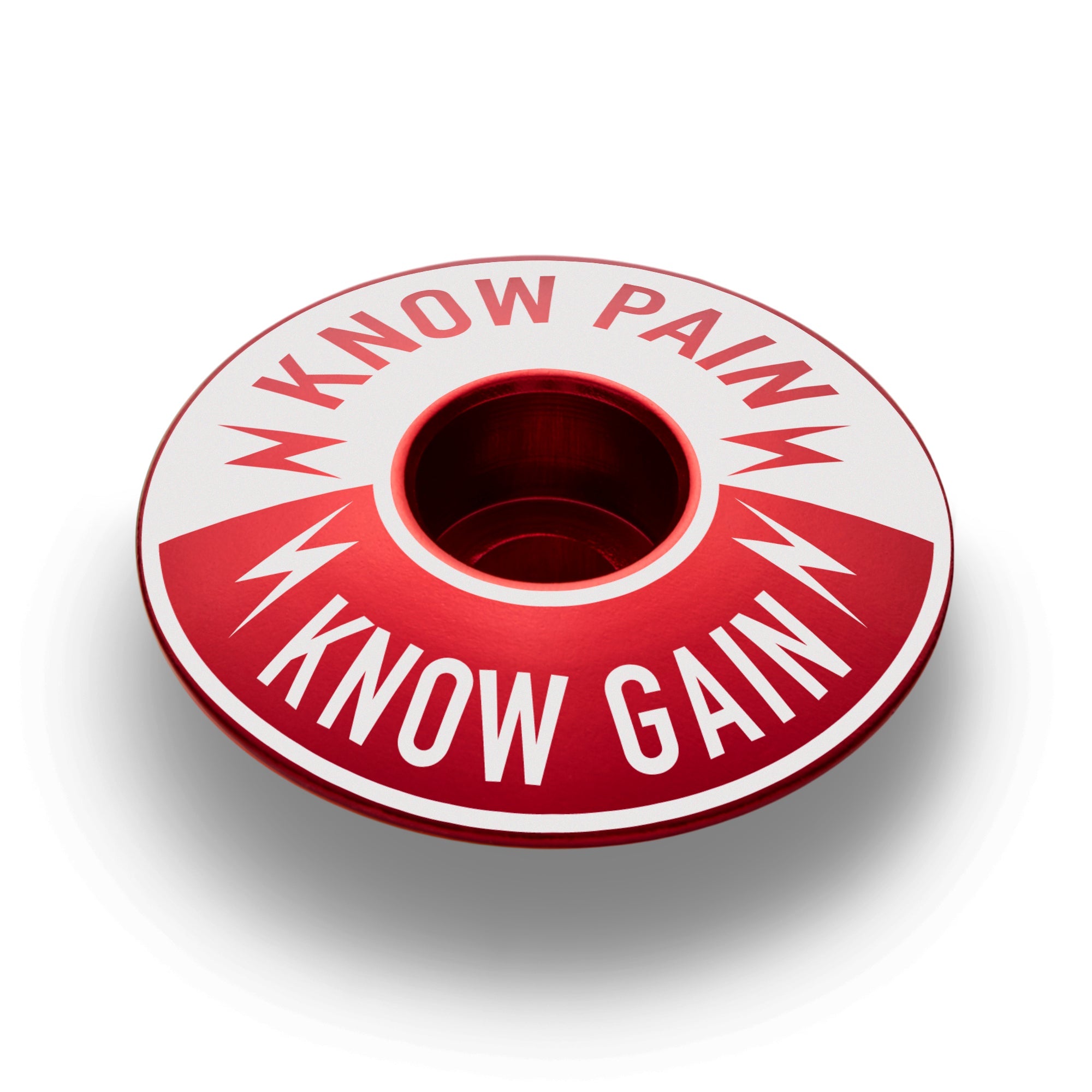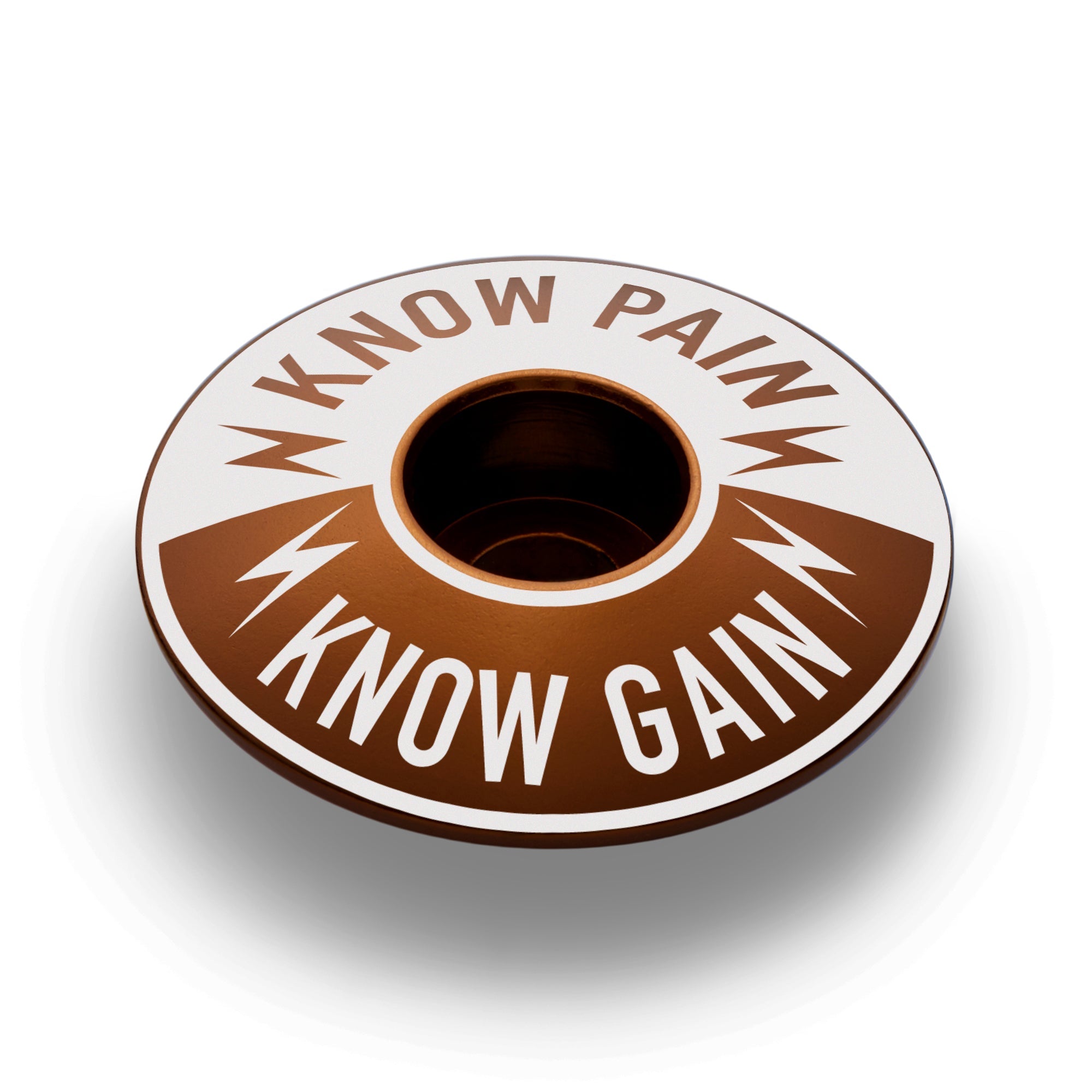 Know Pain, Know Gain bicycle headset cap, featuring a bold design for those who push boundaries. This bike stem cap is a reminder of the strength within you.