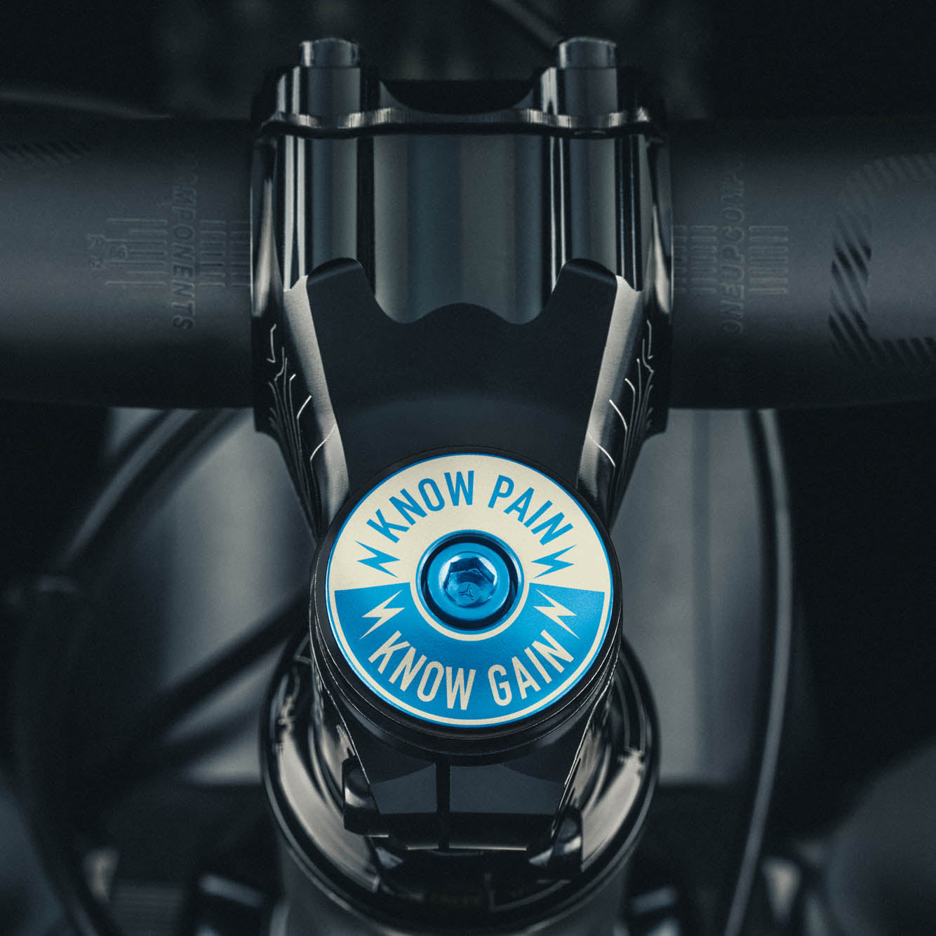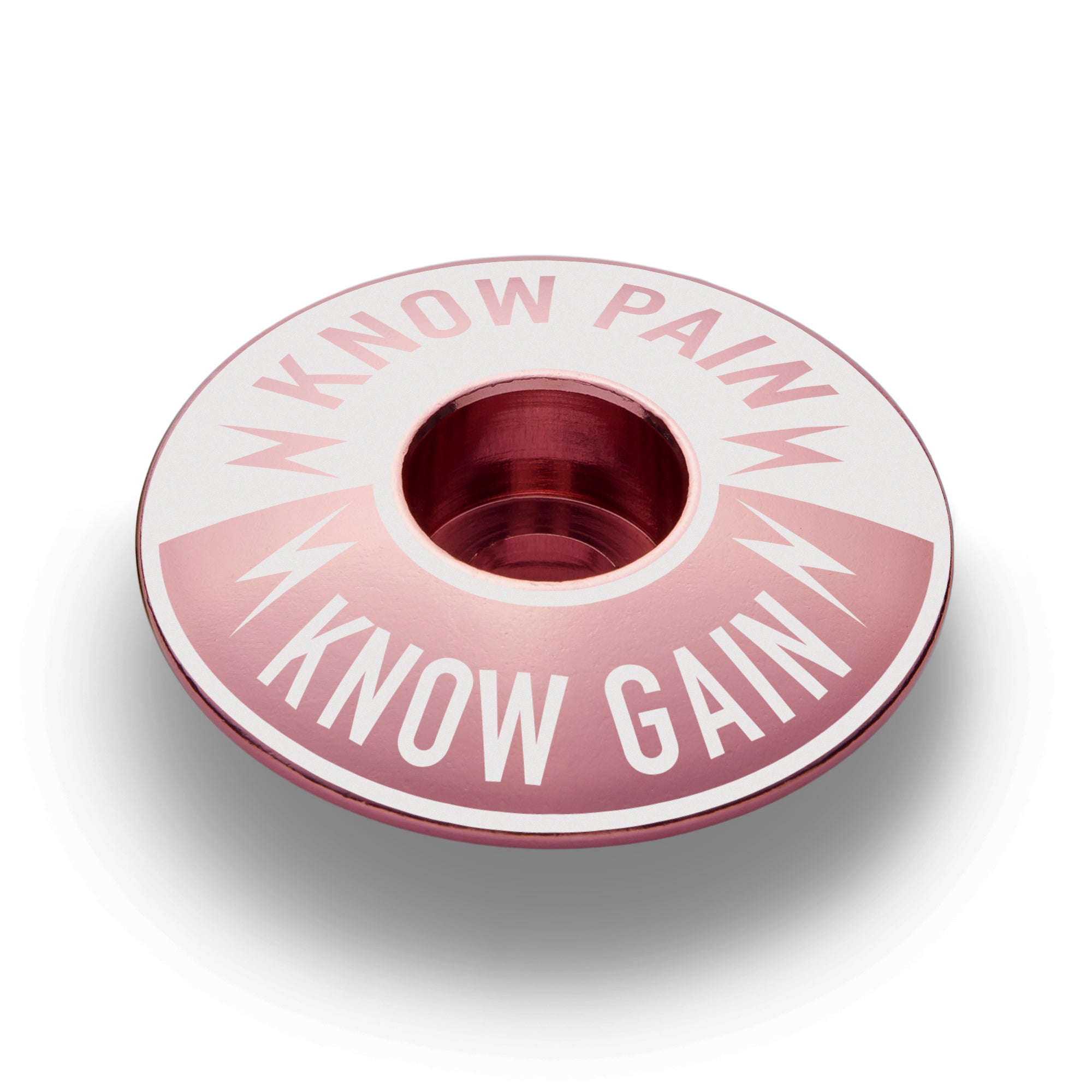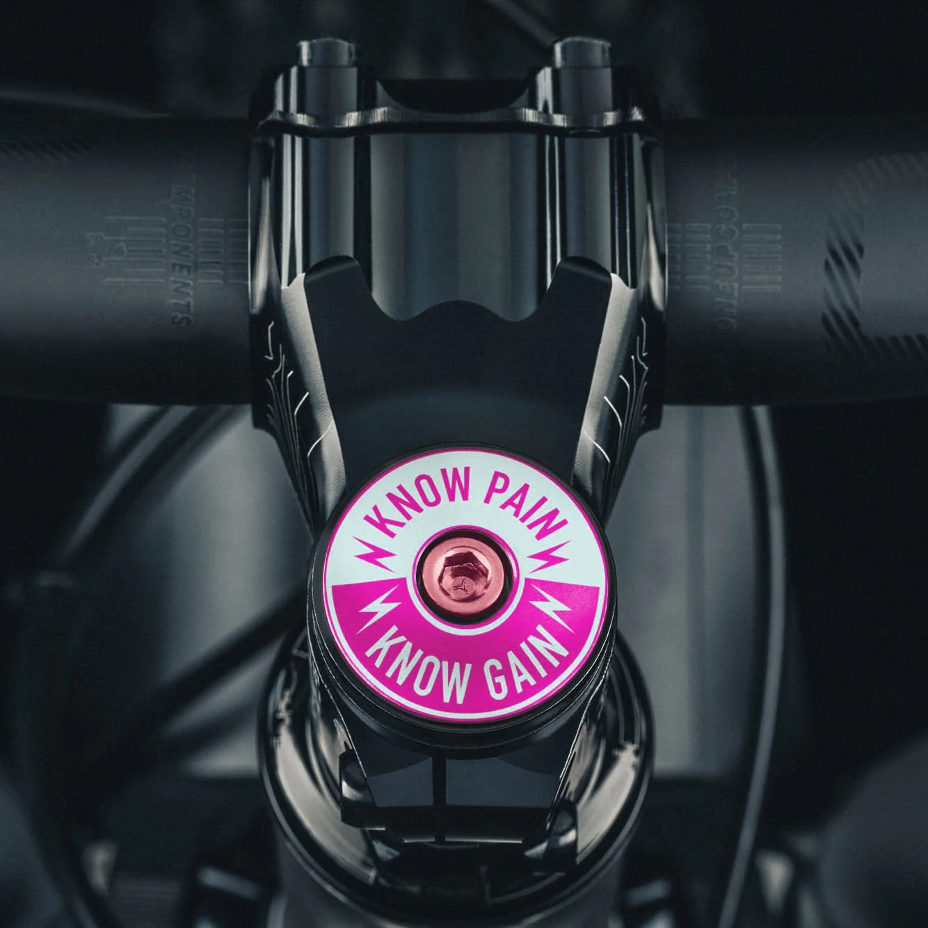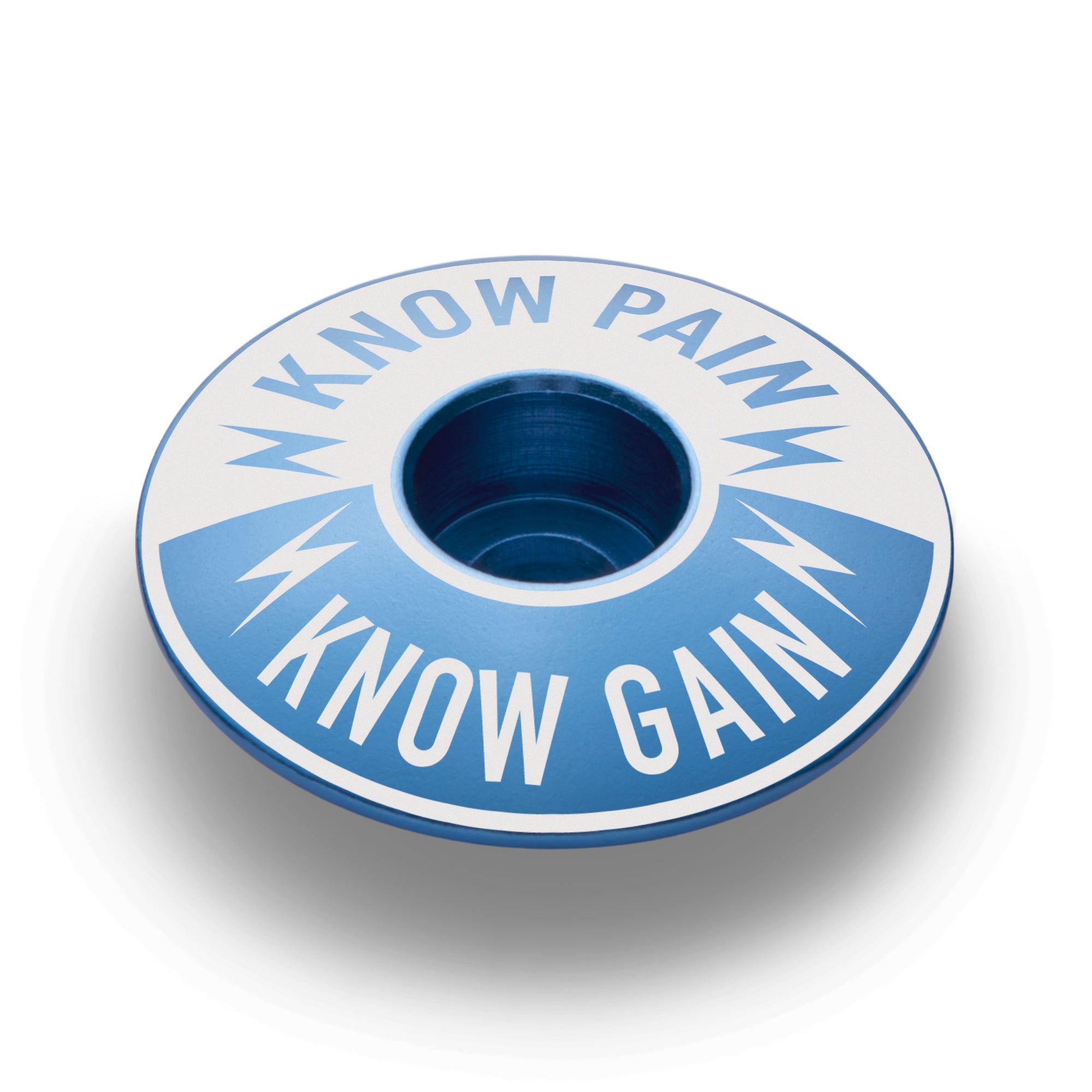 Know Pain, Know Gain bicycle headset cap, featuring a bold design for those who push boundaries. This bike stem cap is a reminder of the strength within you.