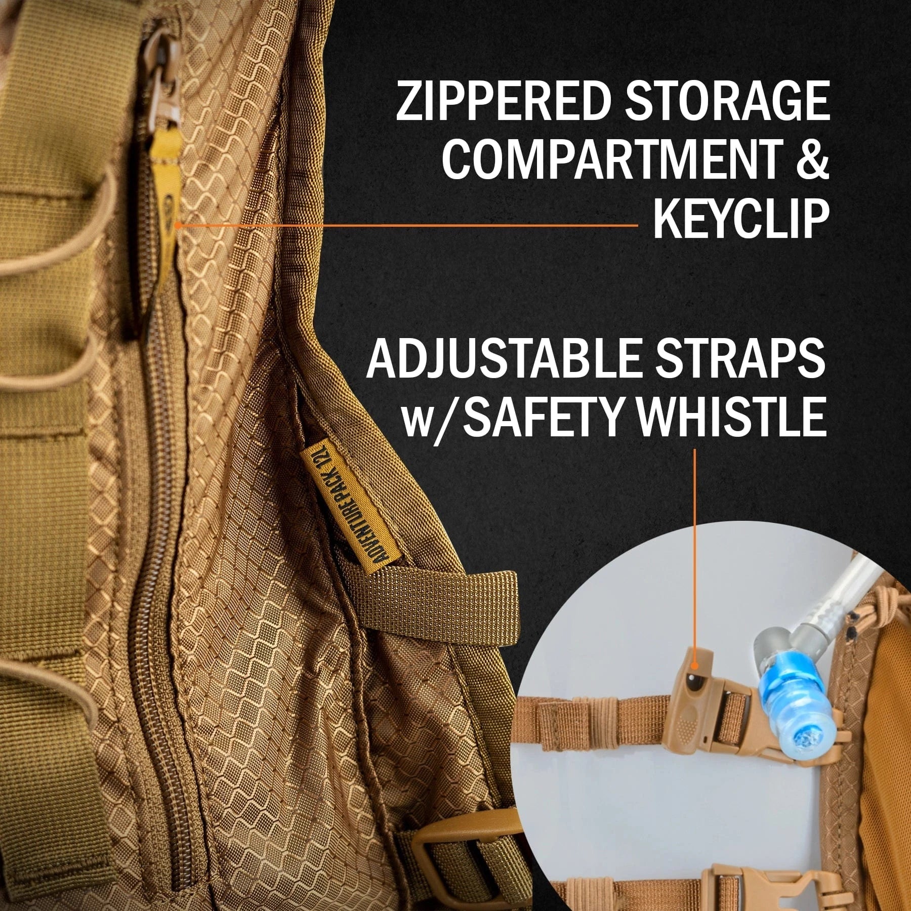 Designed for universal fit, the nylon chest harness comfortably accommodates various body types (up to a 50-inch chest). This adaptable design ensures a snug, bounce-free fit. Includes a 2-liter HydraPak hydration bladder with quick-disconnect for easy refills.