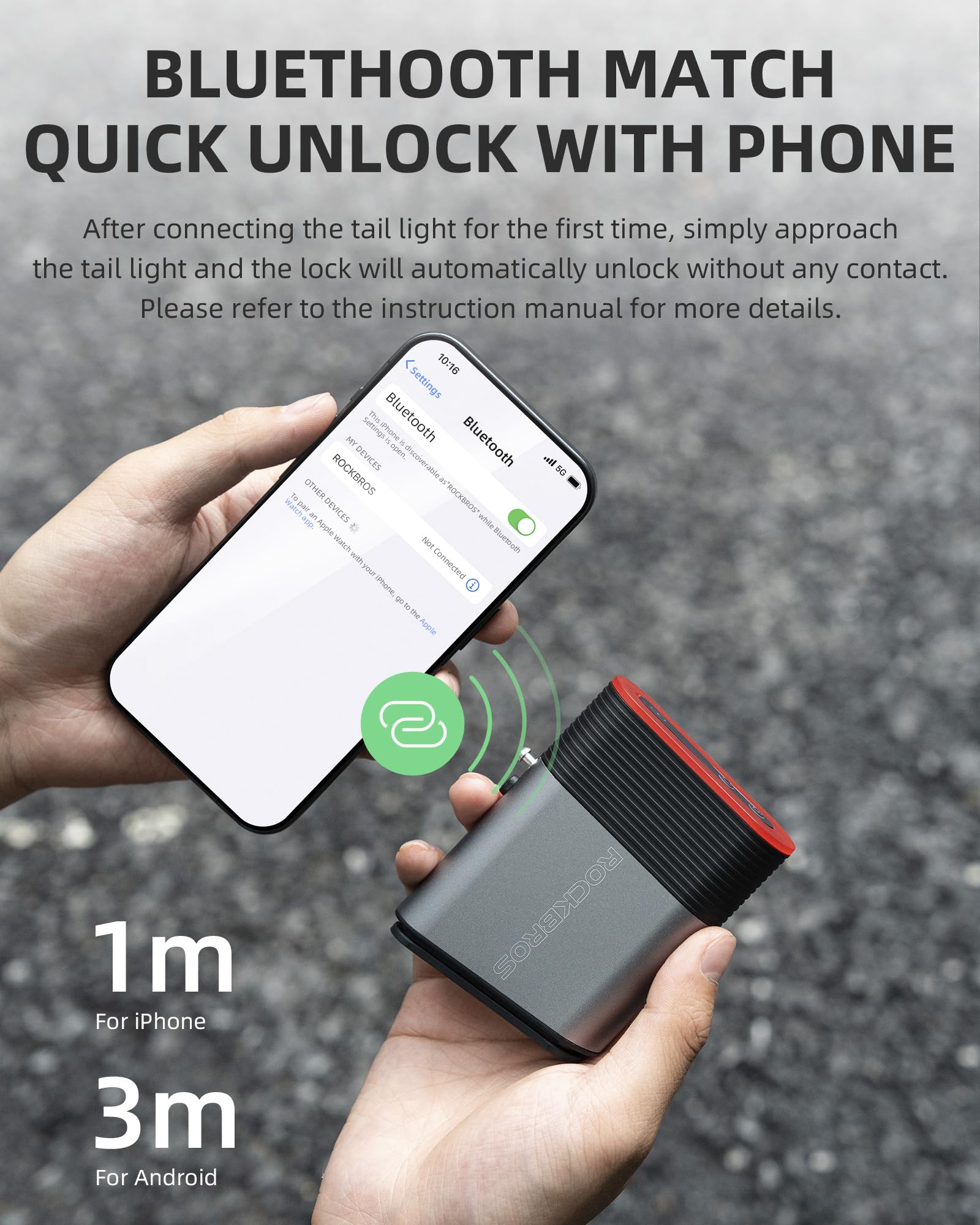 • Intelligent unlocking: With its intelligent unlocking feature, this bike tail light with hidden lock can be unlocked automatically when your phone approaching within 1 meter, eliminating the hassle of carrying a physical key and enhancing both convenience and security for cyclists.