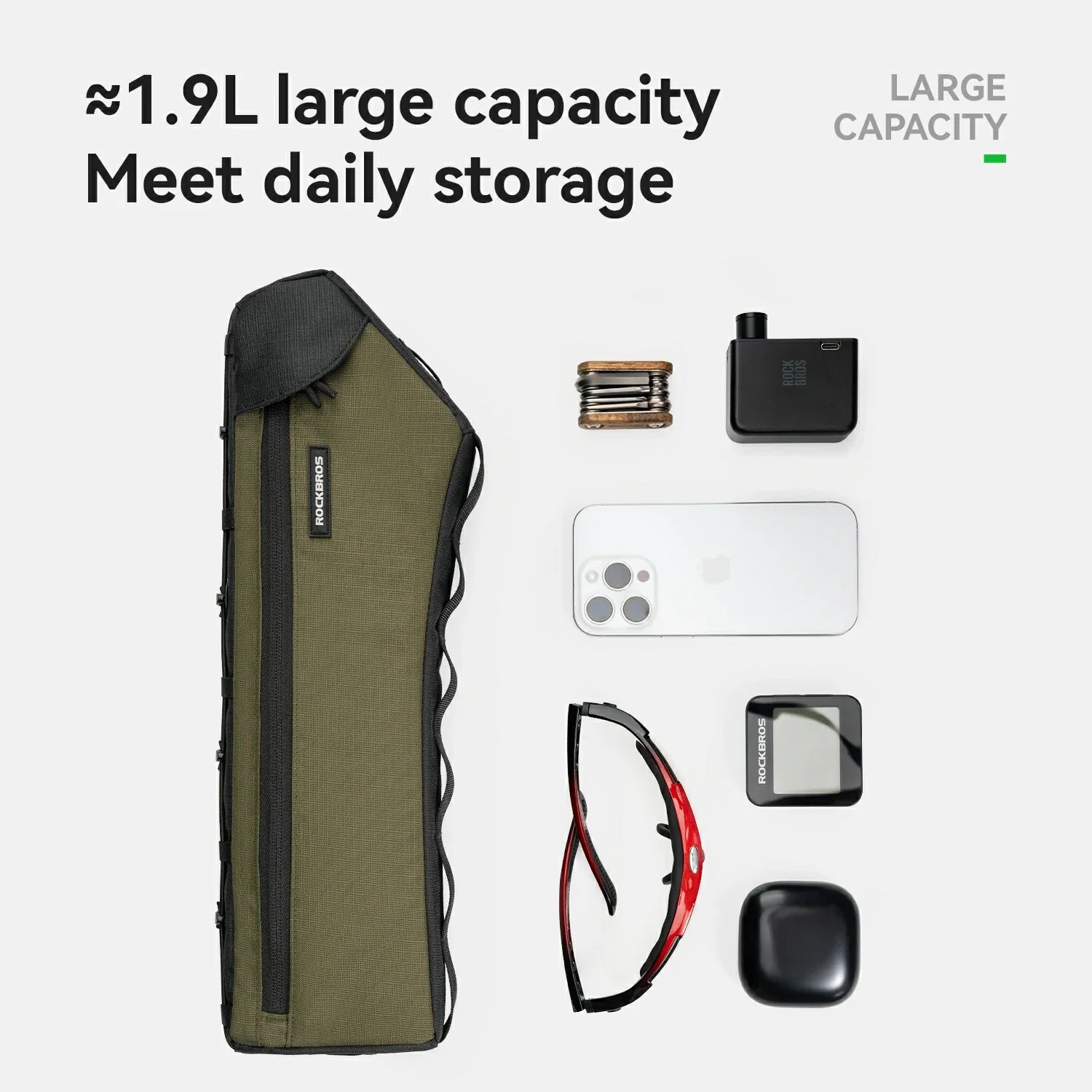 Integration of outdoor functional aesthetics and cycling pragmatism. This lower tube bag offers simple and convenient installation, large-capacity storage, and thoughtful partition design for quick and easy access to your essentials. Compatible with multiple bike types, it features a streamlined, low-wind-resistance design that fits closely to the frame for comfortable, fast rides.