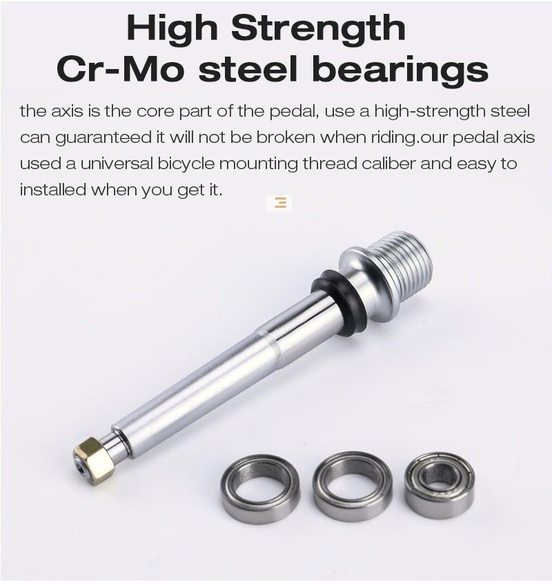 - SUPERIOR SMOOTH BEARING: The lubricated sealed DU bearing platform pedals feature sturdy and durable, keep pedals spin smooth and without noise. The spindle composite of chrome-molybdenum steel material, Carbon fiber bushing outside of the spindle makes it more durable and anti-corrosion.