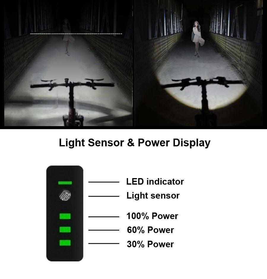 - LIGHT SENSING: The bike front light is designed with unique photosensitive mode. Press the switch, indicator light turn blue and the light enter the sense mode. While the ambient light is insufficient, the bicycle headlight rechargeable will automatically turn brighter, while the ambient light is sufficient, the cycling headlight will change to weak to save energy and lengthen working time.