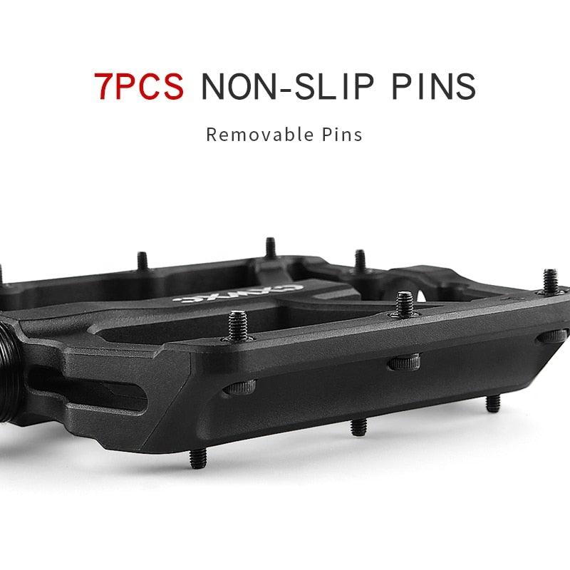 - WIDE PLATFORM & SUPER GRIPPY: With wide platform pedals supports the foot more evenly when riding, provide more comfortable riding experience for you. Perfect for most shoes size. Besides, Stainless steel anti-skids spikes on each side of the mountain bike pedals provide the good grip for you, the studs effectively prevent your shoes from sliding off.