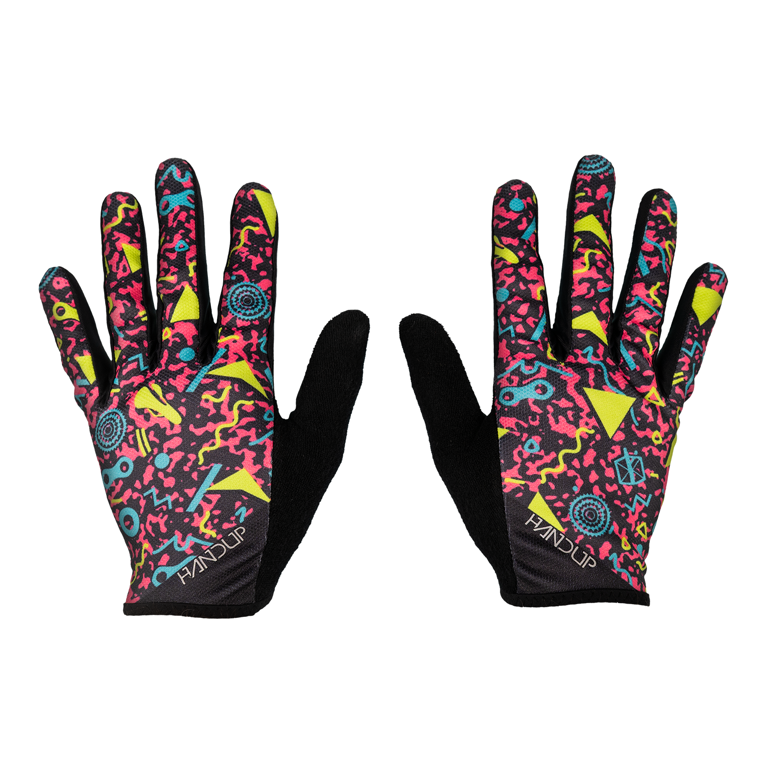 Straight from the roller rink to the trail, these are a full-send throwback to the bright, geometric chaos of ’90s roller rink carpets. Neon colors, wild shapes, and vibes you could feel through your socks, if you ever skated under blacklights while bad pop music blasted, these gloves are for you!