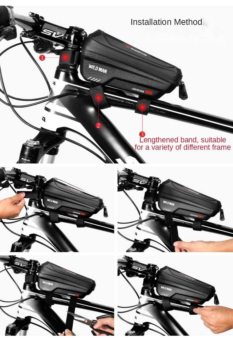 - PREMIUM WATER PROOF QUALITY: The bike top tube bag is made of high-class waterproof material with sealed double zippers closure, which ensures the water doesn’t flow into the bag. You can put the earphone or USB cable between the dual zippers, without opening a new port, which is more waterproof than the bike bag with earphone opening port.