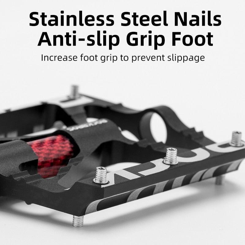 • GREAT GRIPS: THIS mountain bike pedals provide more security on the pedals and effectively prevent your shoes from sliding off, each side of the pedal with 9 stainless steel pins, provide strong grips and we gift extra 3 nails to replace, make the cycling safer, better for riding or racing.