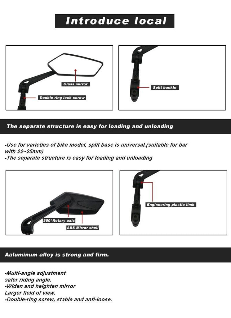 - FULL ANGLE ADJUSTMENT: allows full adjustment to the correct angle of the rear view. The stainless steel screws allow quickly locking the mirror at the right position firmly.
