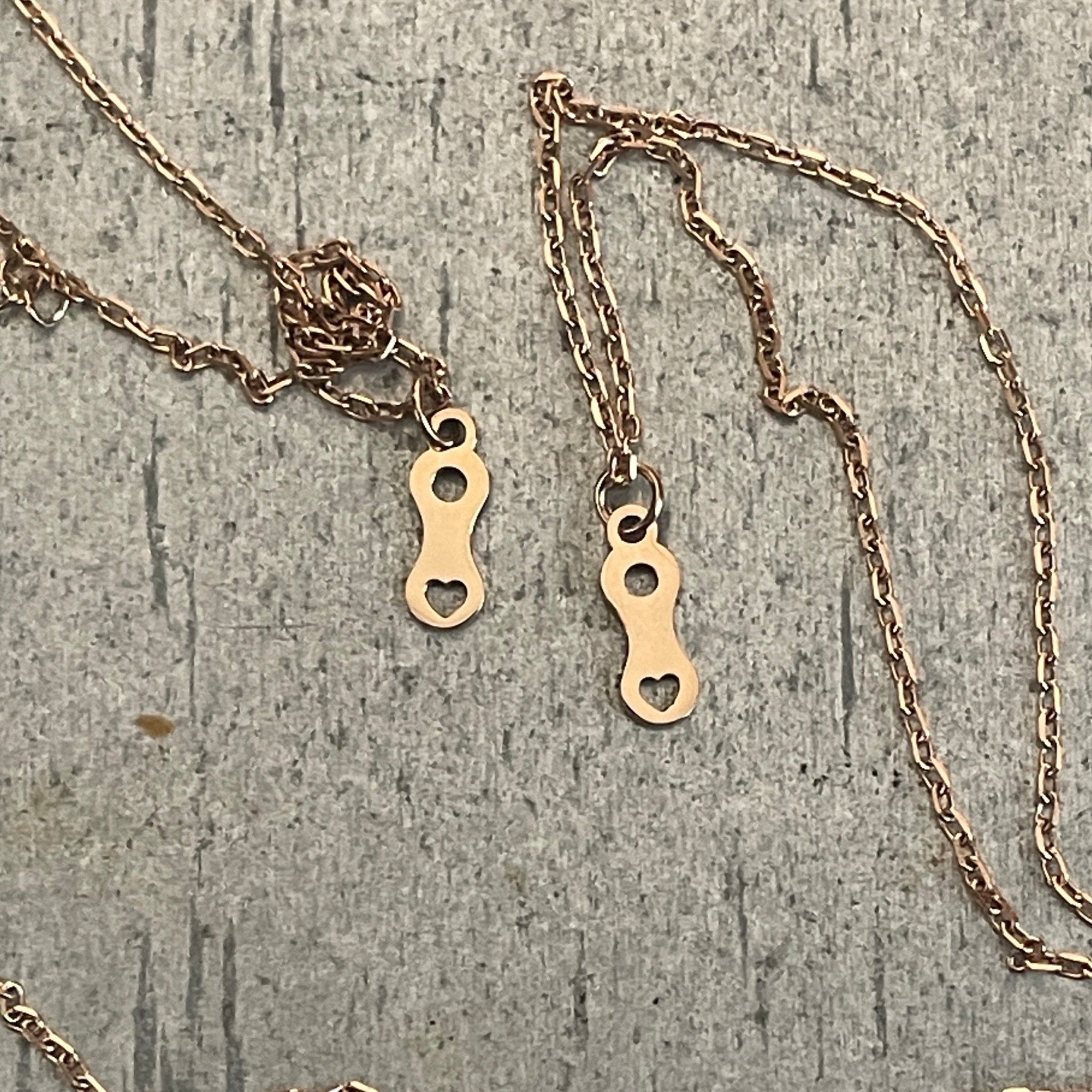 Introducing the small sister of our large chain link pendant. Might be small in size but comes with a big heart. Elegantly display your love and passion for cycling in the most subtle way. Finished in 14k rose gold plating and assembled on a matching 16"+2" cable chain.