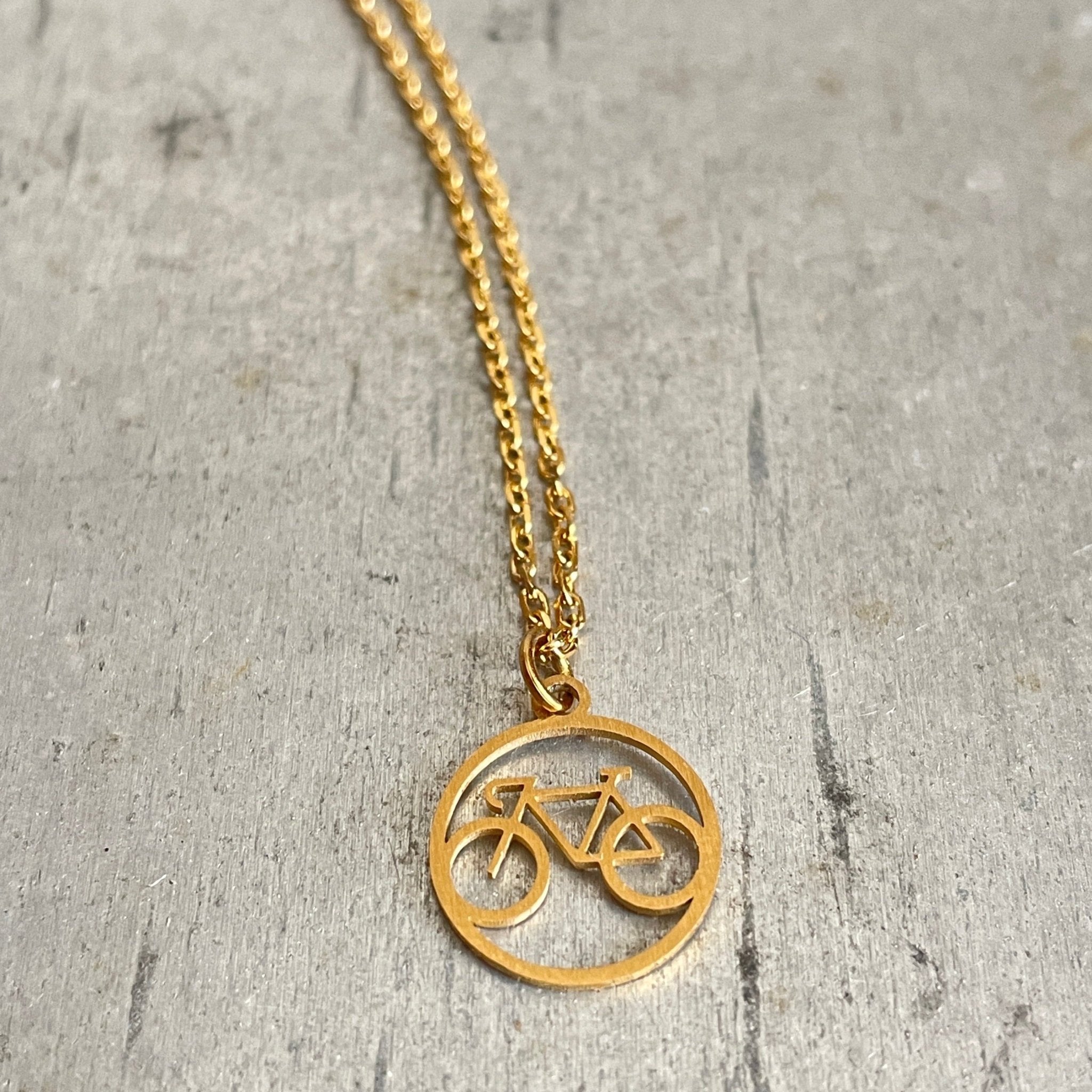 Wear this small bike pendant around your neck for a big statement. Available in stainless steel and 14k plated finish.