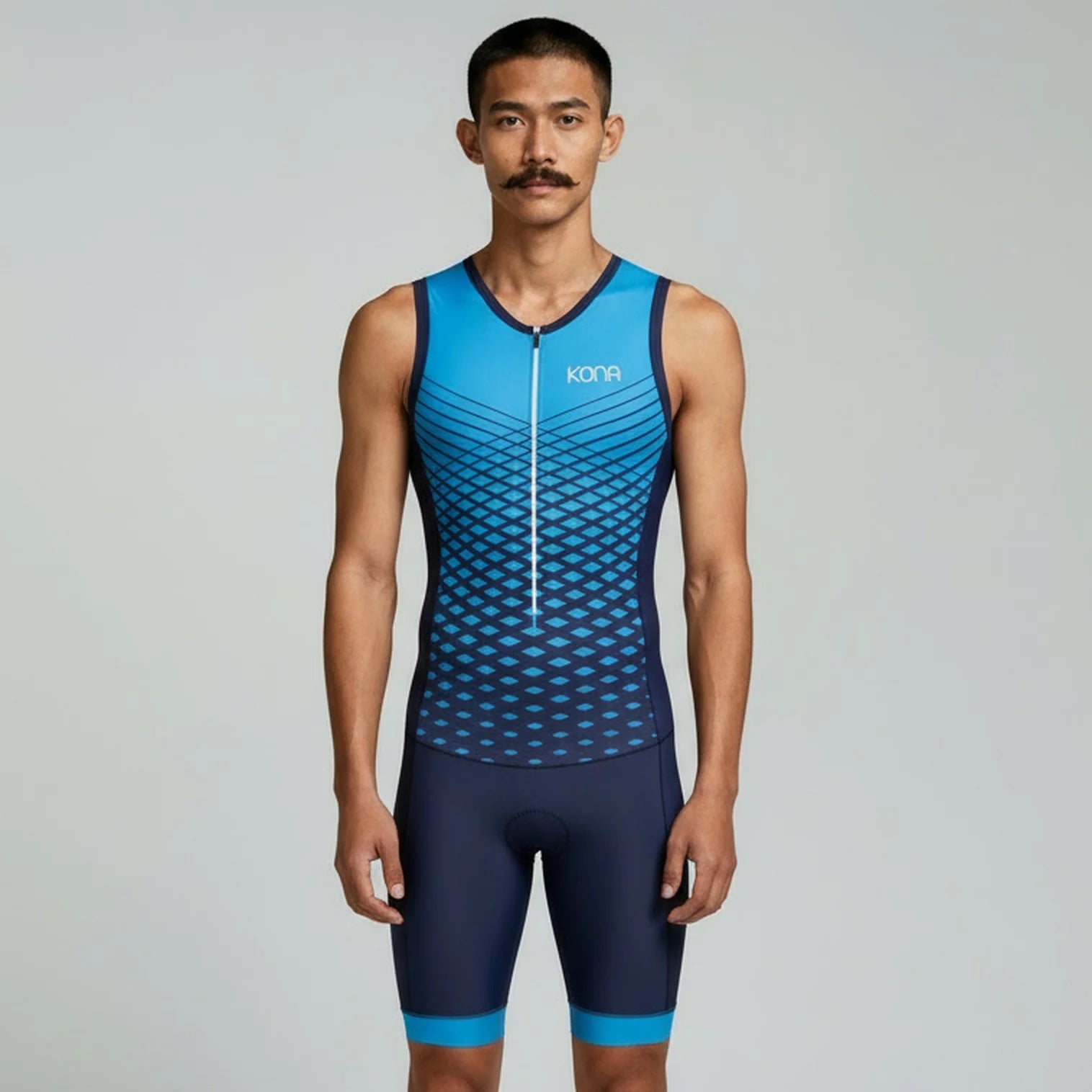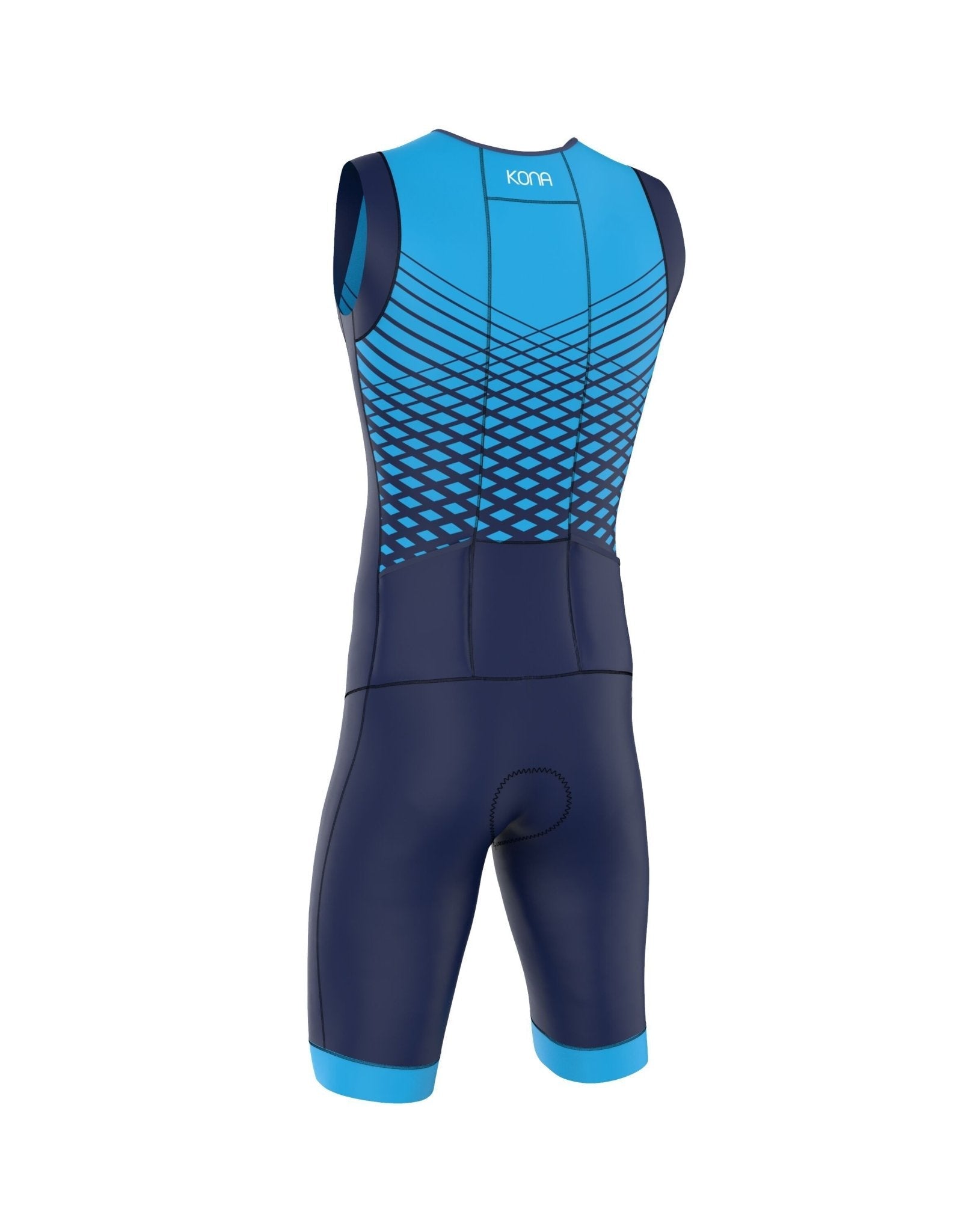 The Team KONA sleeveless triathlon race suit is a one-piece vest+short combo and is the perfect suit for triathlons and offers unbeatable value, comfort and performance for the price. The suit is engineered to preserve free range of motion in the shoulders, support through the core, while the mesh panels provide temperature and moisture management during your ride and run. And the rear pockets keeps your energy gels within reach.