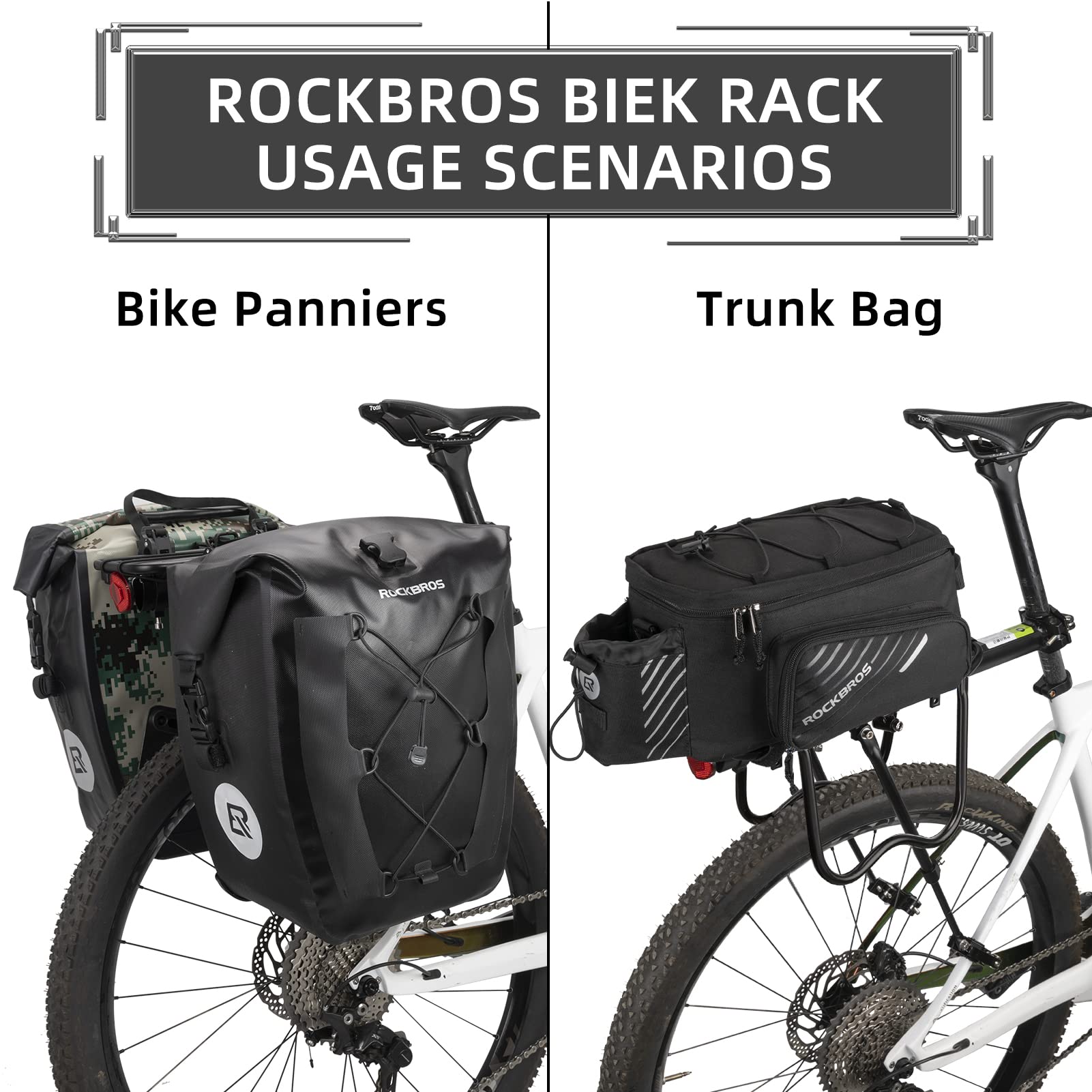 - High Quality Aluminum Alloy: ROCK BROS bike cargo rack is made of high strength aluminum alloy material with stainless steel screws, helps you ride freely in rainy days or bad weather. The rear bike rack has strong load-bearing of MOST 165lb capacity, suitable for daily use and long distance cycling.