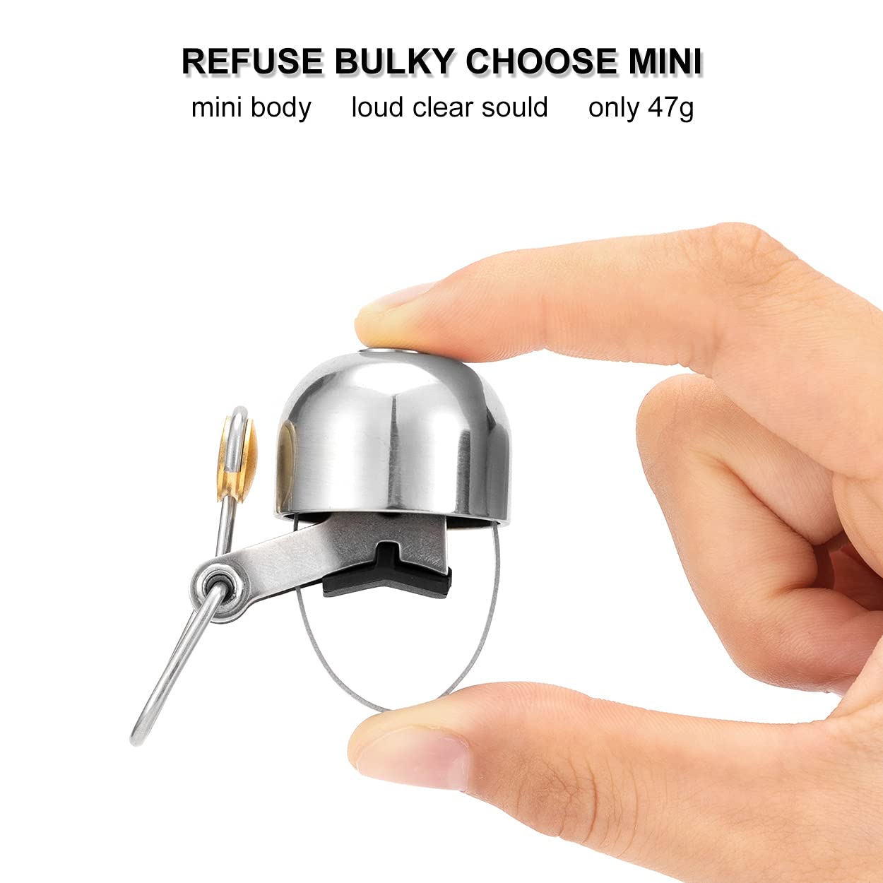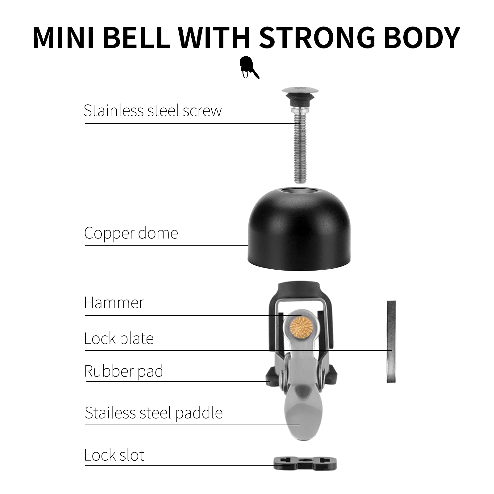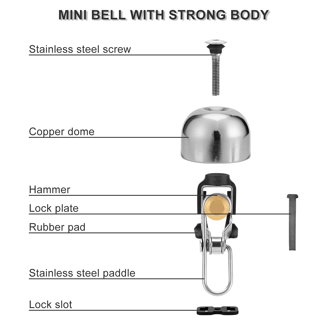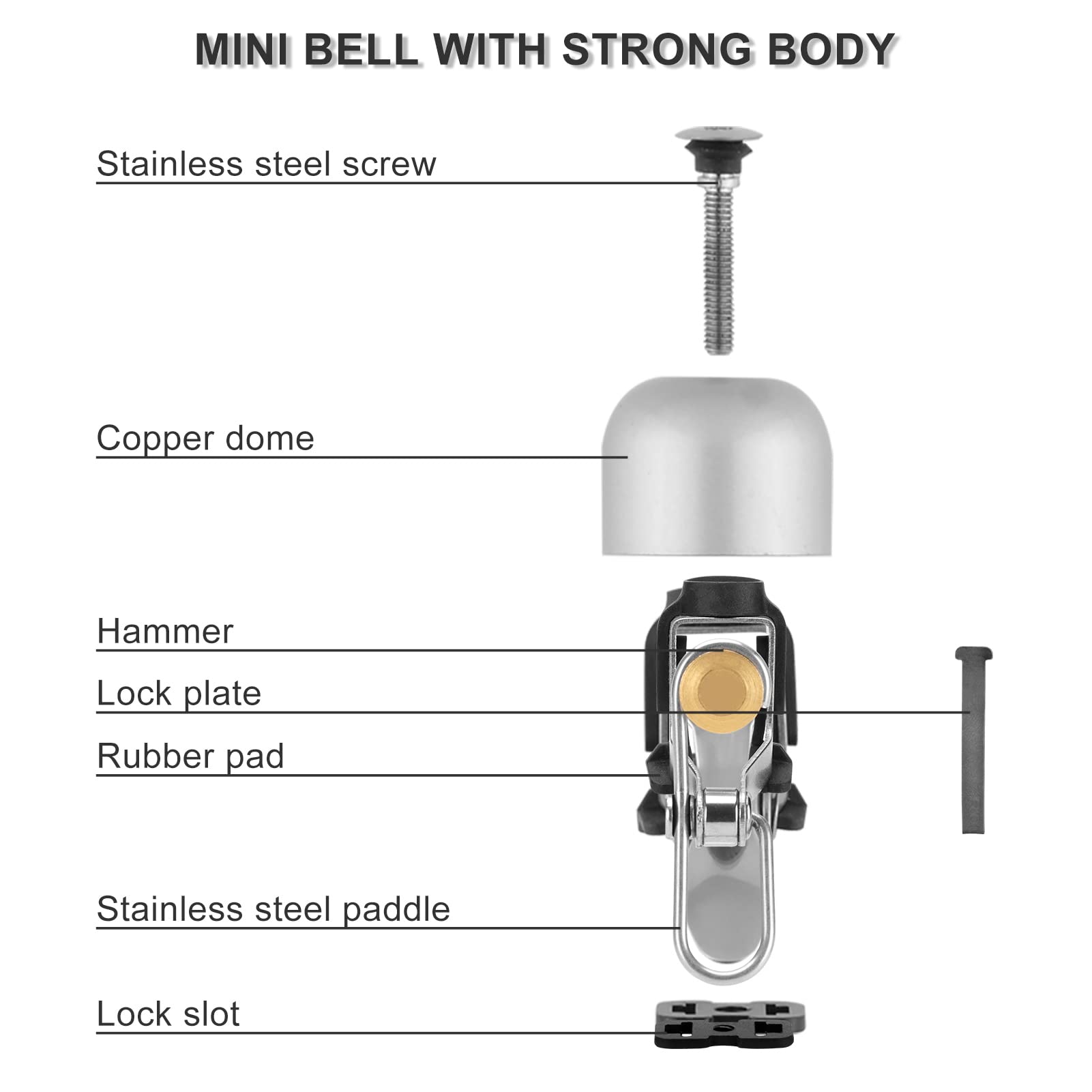 • Easy to Install: Insert the appropriate metal band around the handlebar into the two slots of the bell bottom, then tighten the top bolt until it's snug but please not too tight or the bike bell can't ring.