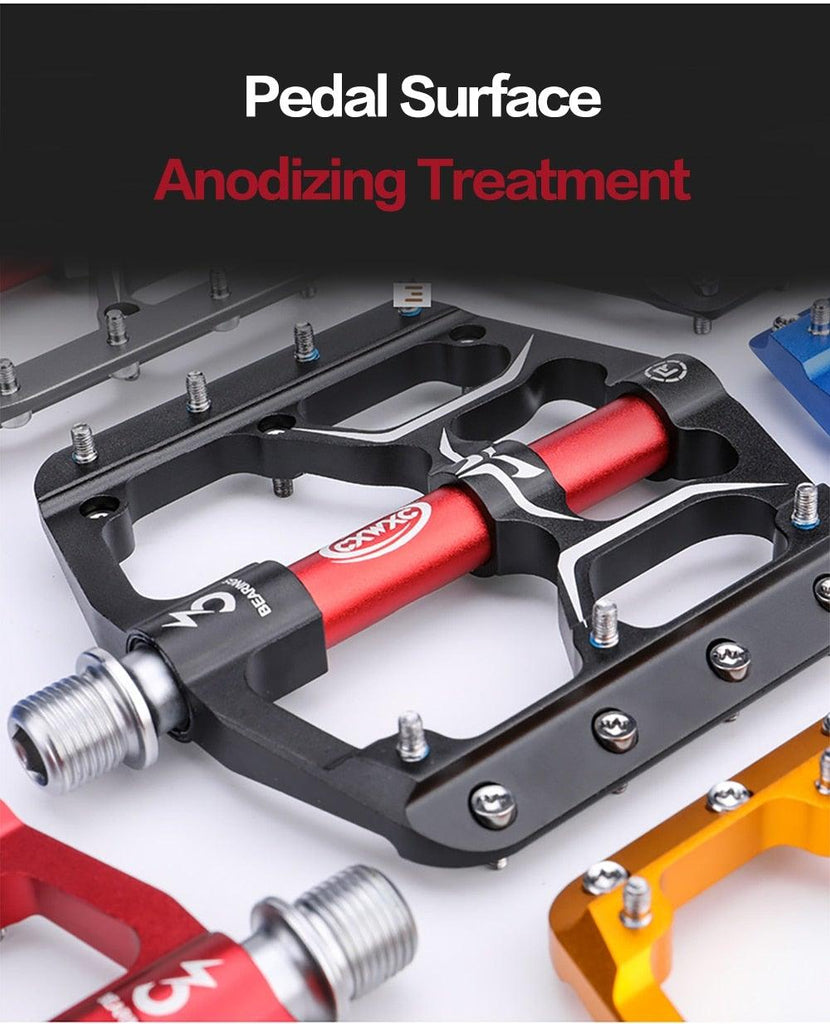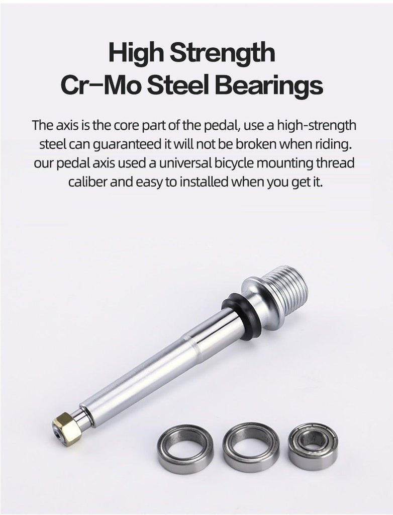 - SUPERIOR SMOOTH BEARING: The lubricated sealed DU bearing platform pedals feature sturdy and durable, keep pedals spin smooth and without noise. The spindle composite of chrome-molybdenum steel material, Carbon fiber bushing outside of the spindle makes it more durable and anti-corrosion.