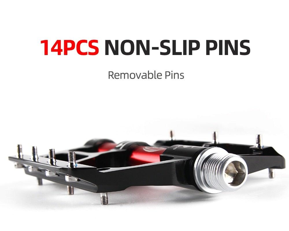 - GREAT GRIPS: Anti-skid nails on each side of the mountain bike pedals provide more security on the pedals and effectively prevent your shoes from sliding off, each side of the pedal with 9 stainless steel pins, provide strong grips and we gift extra 3 nails to replace, make the cycling safer, better for riding or racing.